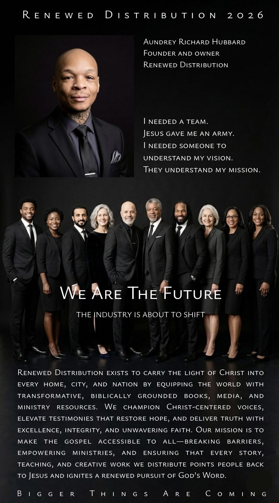 Renewed Distribution is a global Christian distribution company committed to carrying the message of Jesus Christ to the nations through high‑quality books, media, and ministry resources. Founded by author and creative director Aundrey Richard Hubbard, our mission is simple yet profound: to place Christ‑centered content into the hands of every person seeking truth, hope, and spiritual renewal.